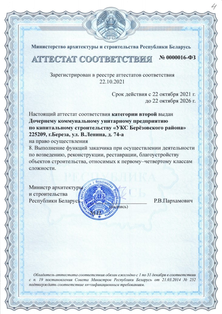 Опыт работы УП «УКС Берёзовского района» в сфере выполнения функций заказчика в строительстве составляет более 50 лет. Предприятие имеет право осуществлять свою деятельность на объектах первого-четвертого классов сложности.